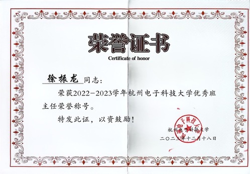 【2020.12.08】 徐振龙被评为2019-2020学年校优秀班主任。 【2020.10.29】 祝贺课题组本科生刘逸喆荣获2020年浙江省本科高校国家奖学金特别评审奖(全省共十位)!此外,刘逸喆获得杭电2021年免试攻读硕士学位研究生资格(学术特长生),被成功推免至西北工业大学中澳新联合信息物理融合交互实验室攻读硕士研究生。