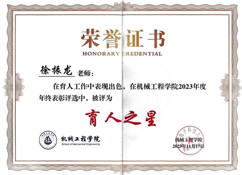【2023.12.26】 徐振龙被评为2022-2023学年校优秀班主任。 【2023.12.5】 徐振龙因在育人工作中表现出色,在机械工程学院2023年度年终表彰评选中,被评为“育人之星”。