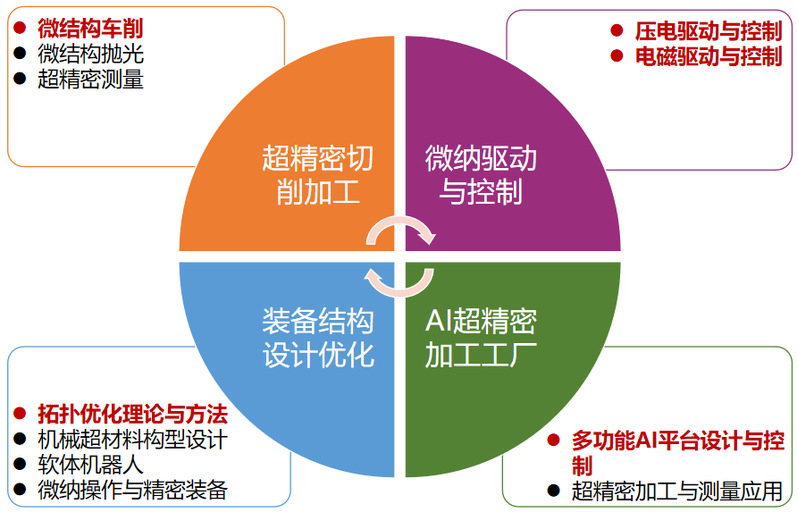 主要研究领域 微纳定位平台设计与控制:针对多轴纳米定位平台定位需求,开展基于压电叠堆、音圈电机、变磁阻驱动的纳米至毫米尺度的纳米精度定位装置设计理论,着重研究驱动器解析建模与优化设计方法,研究柔性导向机构空间力学建模与拓扑优化设计方法;针对位置控制,研究面向应用场景的高带宽、高鲁棒、高精度位置控制方法。 复杂光学表面超精密切削:针对光学自由曲面、微结构光学表面(如微透镜阵列、衍射微结构等)等表面复杂几何形状,围绕金属材料、光学晶体材料、特殊难加工材料等,开展基于单点金刚石刀具的超精密车削加工新工艺、新方法与新装备的研究。 |