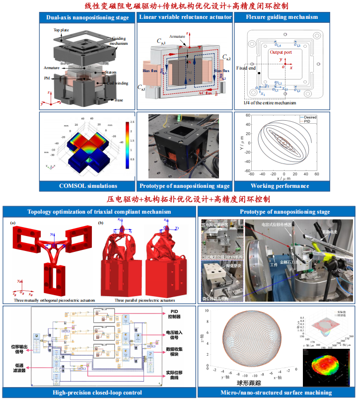 主要研究领域 微纳定位平台设计与控制:针对多轴纳米定位平台定位需求,开展基于压电叠堆、音圈电机、变磁阻驱动的纳米至毫米尺度的纳米精度定位装置设计理论,着重研究驱动器(音圈、变磁阻)解析建模与优化设计方法,研究柔性导向机构空间力学建模与拓扑优化设计方法,研究大负载主动磁路设计方法;针对位置控制,研究面向应用场景的高带宽、高鲁棒、高精度位置控制方法。